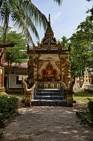 Wat Luang in Attapeu is een prachtig voorbeeld van boeddhistische religieuze architectuur in het zuiden van Laos. Deze afbeelding toont een tempel die rijkelijk is versierd met rood en goud, wat de heilige kunst van de regio perfect illustreert. De daken op meerdere niveaus, versierd met vergulde naga's, rijzen de lucht in, terwijl bloemmotieven en mythologische motieven de muren en zuilen met veel verfijning bedekken.