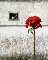 Fotowerk van verweerde oude muren met een luik. In de vensterbank staat een metalen gieter klaar om de reusachtige rode bloem van de Celosia plant op de voorgrond wat liefdevolle aandacht te schenken.