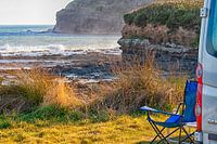 Camper met stoeltje op een plek vlak aan de rand van de zee met uitzicht op de mooie kust van het zuiden van het Zuider eiland van Nieuw Zeeland