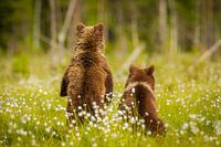 Twee nieuwsgierige jonge Bruine beertjes staan aandachtig te kijken naar iets in het bos op de achtergrond. Het is voorjaar en de beertjes staan in een moeras tussen bloeiend Wollegras. De beertjes werden van achteren gefotografeerd, hetgeen de foto een bijzondere dynamiek geeft.