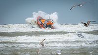 Reddingboot van de KNRM vecht zich door de branding, terwijl de zeemeeuwen toekijken.