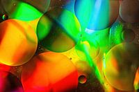 Oliedruppels in water die via de licht diffractie van een CD die eronder ligt een creatief beeld met alle mogelijke kleuren oplevert.
