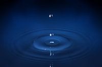 High speed opname van waterdruppels die in water vallen met een blauwe achtergrond