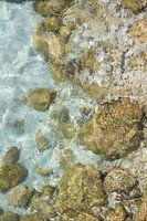 Ik heb dit beeld gemaakt vanaf één van de vele hangbruggen, die je tegen komt op een wandeling tussen Trenta en Bovec. Je kijkt hier recht van boven op het water, waar verschillende rotsen verspreid op de rivierbodem liggen. De rivier krijgt zijn mooie blauwe kleur, door de witte kalkrotsen waar het landschap uit is opgebouwd.