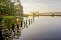 Het 'zwembad' in Sassenheim in de vroege morgen met de spiegeling in het water, de opkomende zon en de mist maakt het tot een sfeervol plaatje. De koeien en de hekken maken het af.