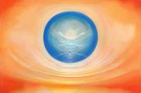 Dit indrukwekkende olieverfschilderij van groot formaat illustreert op indrukwekkende wijze de unieke eigenschappen van water en hoe het in de natuur vormen en structuren aanneemt. De kern van het schilderij wordt gevormd door een scène in een cirkel, waarvan het midden wordt ingenomen door een boot met roeispaan.