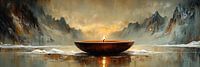 Waterbergen - Dit stilleven schilderij toont een enkele, brandende kaars in een brede, bronzen schaal die centraal staat op een spiegelende wateroppervlakte, omgeven door imposante, mistige bergtoppen die baden in een gouden gloed, wat een sfeer van stilte en reflectie creëert.