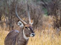 Nieuwsgierige waterbok in Tanzania met droog gras op de achtergrond