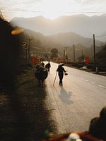 Tijdens zonsondergang loopt de rijstboering met haar waterbuffels terug naar huis na een lange dag werken op de rijstvelden.