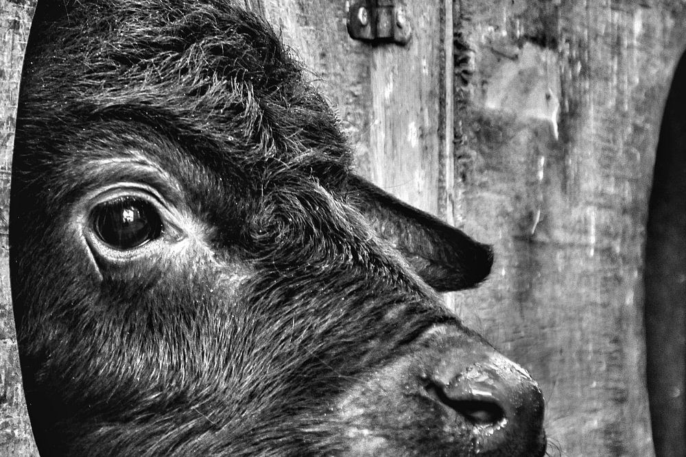 Een jong waterbuffeltje kijkt verwonderd de wereld in. Wanneer mag ik de wei in?