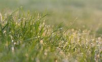 Waterdalingen op grassprietjes in het zonlicht in de ochtend
