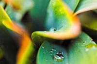 Creatieve macro foto van een waterdruppel op het blad van het Lelietje van Dalen