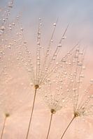 "Waterdruppels aan de paardenbloempluisjes" is een macrofoto van waterdruppels op de pluisjes van een paardenbloem. Deze bewerkte foto heeft voornamelijk (zacht) roze en blauw-grijze tinten in de achtergrond.