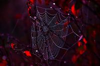 Ook dit spinnenweb, op de achtergrond zijn mooie kleuren van bloemen te zien.