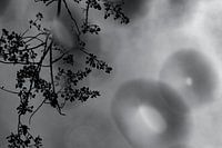Reflectie van waterdruppels en takjes, artistieke natuurfotografie in zwart-wit.