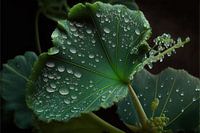 Deze verbluffende close-up in hoge resolutie legt de delicate schoonheid vast van waterdruppels die delicaat op een blad rusten. Elke druppel is zeer gedetailleerd, reflecteert het licht en vergroot de fijne texturen van het blad. De donkere achtergrond benadrukt de heldere helderheid van de druppels en creëert een sterk contrast dat de aandacht vestigt op de subtiele elegantie van de natuur. Perfect voor iedereen die houdt van botanische fotografie, minimalisme en het subtiele samenspel van licht en textuur.