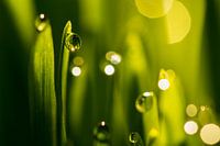 Dauwdruppels op de topjes van grassprieten met een mooi bokeh. Een groen geheel met de scherpte op een paar druppels.