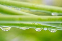 Waterdruppels aan de plantstengel - Waterdruppels hangen zwaar aan de stengel van een Hosta plant na een zomerse regenbui