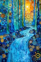 Kleurrijk landschap met een waterval,bomen en een zonsondergang in de stijl van Gustav Klimt.