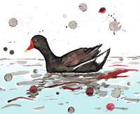 Een illustratie in gewassen Oost-Indische inkt van een zwemmende waterhoen. Je ziet de vogel van opzij waardoor zijn grappige staart mooi uitkomt. Hij kijkt je met een oogje vriendelijk aan. Het oog is rood. Wilde tekening met drippings en spetters. In het water zie je grofweg de reflectie van de vogel. Het water is digitaal blauw…