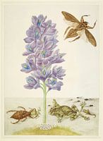 Aquarel van een waterhyacint (Eichhornia crassipes) met de levenscyclus van de reuzenwants (Lethocerus grandis) en de geaderde boomkikker (Phrynohyas venulosa). Dit is een versie van plaat 56 van Merian's Metamorphosis Insectorum Surinamensium.