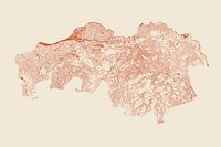 Alle meren, rivieren, kanalen, beken, sloten en andere waterlopen van de provincie Noord Brabant zijn afgebeeld op deze hoge detail doch minimalistische kaart. Daarom is het niet een landkaart maar een waterkaart. Een van de mooie dingen aan dit type kaart is dat door alleen het water aan te geven vanzelf andere objecten op het land naar voor komen zoals bossen, steden en polders. Als waterland is Nederland hier uitermate geschikt voor.