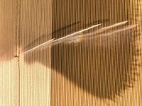 Besproeiingsmachine die water sproeit op een veld tijdens een droge en warme lentedag in de Noordoostpolder, Flevoland, Nederland. De laatste jaren zijn er langere periodes van droogte geweest die problemen veroorzaakten voor boeren die gewassen verbouwden.