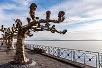 Naakte boomstammen op de promenade langs het meer in Meersburg Duitsland met uitzicht op het Bodenmeer in de winter