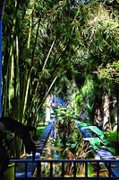 Een foto van een van de vele waterpartijen in de Jardin Majorelle in Marrakech, Marokko. Deze heeft de beroemde kleur majorelleblauw, en wordt aan beide zijden overschaduwd door de reusachtige bamboe die in deze botanische tuin groeit.