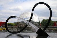 De afbeelding toont een moderne sculptuur waar water doorheen stroomt. De sculptuur bestaat uit twee grote, zwarte, gebogen buizen die een lus vormen en elkaar kruisen. Water wordt vanaf de bovenkant van een buis gespoten en stroomt naar beneden in de andere buis, wat een interessant visueel effect creëert. Op de achtergrond is een…