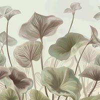 Verzameling bladeren van de waterlelie, met een esthetische arrangement van hun elegante vormen en zachte groen- en grijstinten. De compositie, gekenmerkt door de vloeiende lijnen en de subtiele kleurovergangen, roept een gevoel van rust en balans op.