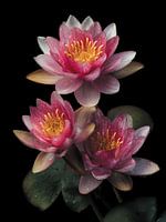 Een waterlelie lijkt te zweven in de duisternis, haar tere bloemblaadjes ontvouwen zich als een stille explosie van kleur. Tegen de diepzwarte achtergrond schitteren delicate tinten roze, helderwit of zonnig geel met een bijna magische intensiteit.