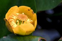 Een gele waterlelie die nog tot volle bloei moet komen.