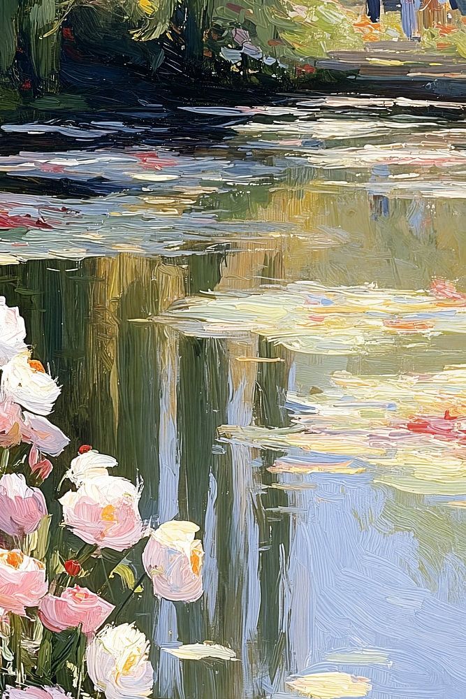 Een impressionistisch schilderij van een idyllische vijverscène met roze en witte rozen die langs de oever bloeien. Het wateroppervlak wordt versierd met waterlelies en weerspiegelt de omringende natuur in zachte, pastelachtige tinten. In de verte schemeren figuren op een pad tussen het groen, wat diepte en perspectief aan het geheel geeft.