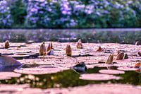 Uitgelicht beeld van gesloten waterlelies in een vijver met op de achtergrond de bokeh van een paarse Rhododendron in bloei.