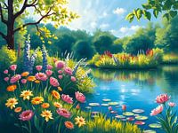 Het schilderij toont een sereen meer met kleurrijke bloemen en weelderig groen. Claude Monet's "Waterlelie vijver" en zijn serie waterlelie schilderijen zijn voorbeelden van deze stijl, gericht op de schoonheid van water en florale landschappen.