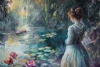 Waterlelies - Dit vrouwen schilderij toont een elegante dame in een lichte jurk, kijkend naar een sereen waterlandschap met roze waterlelies en weelderige groene vegetatie, in een weerspiegeling van rust en natuurlijke schoonheid.