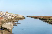 Waterweg en dijk op Ameland om natuurgebied met vogels richting Friesland. In het water vind je naast vogels, kleine krabjes