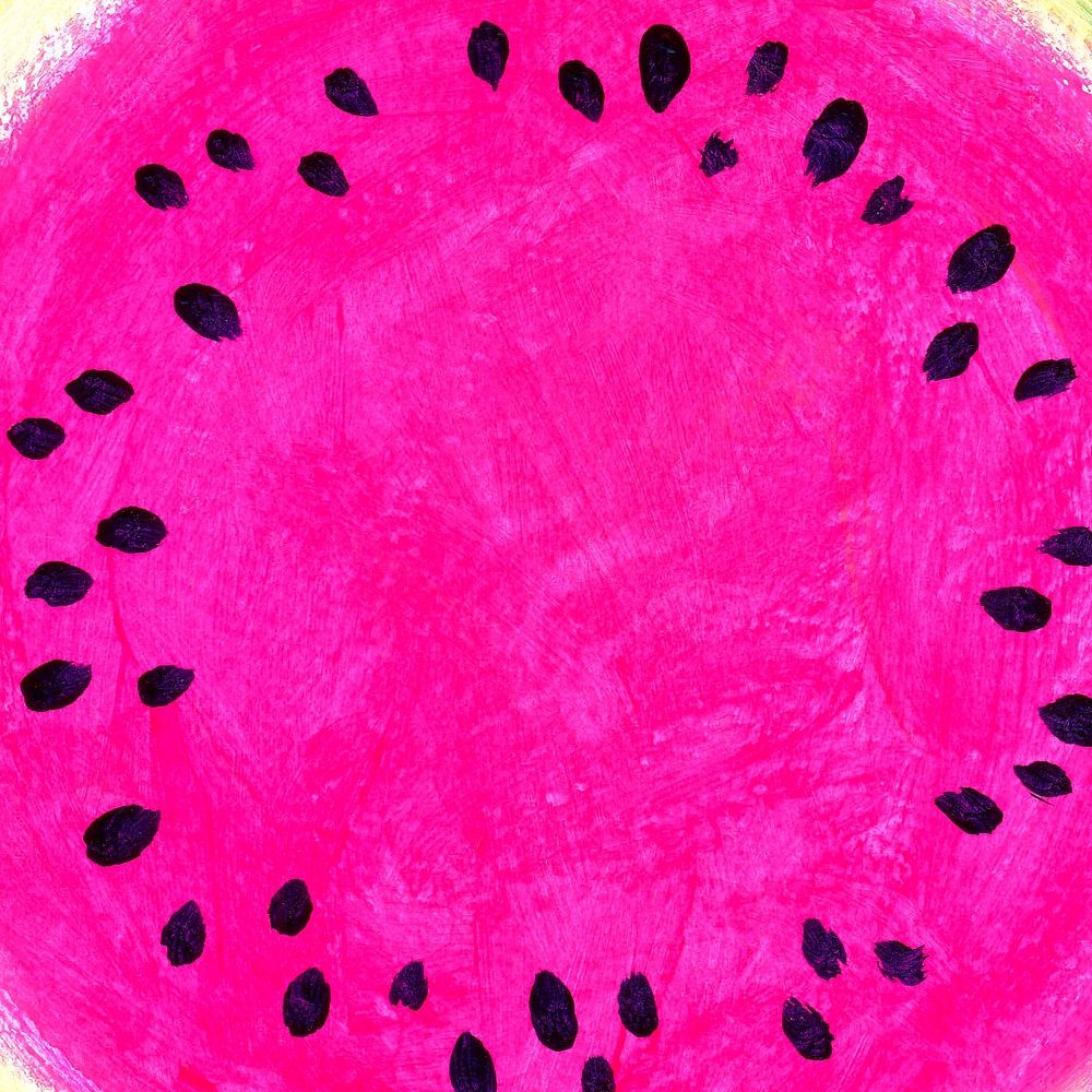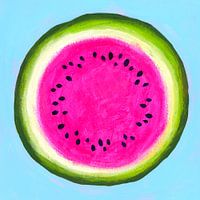 Watermelon Circle is een acrylschilderij in eigentijds vierkant formaat van kunstenaar Karen Kaspar. Het toont een schijf van een watermeloen in lichtroze en groen op een lichtblauwe achtergrond. Het schijfje heeft de vorm van een ronde cirkel. Dit schilderij is onderdeel van mijn mini-serie van drie acryl schilderijen van verse watermeloenen in heldere tinten roze, groen, wit en blauw in eigentijds vierkant formaat - Watermelon Triangle, Smiling Watermelon en Watermelon Circle. 324
