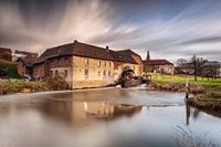Lange sluitertijd opname van de weilanden rond de watermolen van Wijlre met zicht op de kerk en de Brand brouwerij