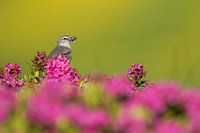 Waterpieper (Anthus spinoletta spinoletta) met voer in een alpenwei in de Alpen van Zwitserland. Prachtige paarse bloemen in de voorgrond.