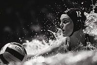In de wereld van water en intensiteit komt dit werk tot leven. Deze zwart-witfoto vangt het moment waarop een waterpolospeelster, doordrenkt met vastberadenheid, vooruit kijkt met een ongekende focus. Haar hand omklemt de bal, klaar om de actie te ontketenen.