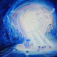 Dit schilderij toont een fascinerende scène die de kijker meeneemt naar een surrealistische wereld van spiritualiteit. De focus ligt op een herder wiens lichaam een ongewone blauwe tint heeft. Hij leunt ontspannen in het enkeldiepe water en toch komt zijn onderarm omhoog alsof het water waarin hij ligt verbazingwekkend stevig…
