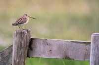 Watersnip (Gallinago gallinago) op een paal in een weiland in Friesland