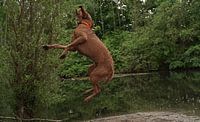 Over ‘Waterspelletjes aan het meer met een bruine Magyar Vizsla ruwharige hond .’ van Babetts Bildergalerie