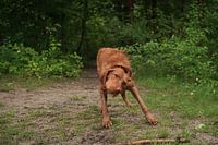 Waterspelletjes aan het meer met een bruine Magyar Vizsla ruwharige hond . van Babetts Bildergalerie