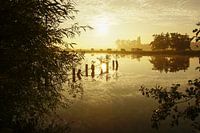 Het 'zwembad' in Sassenheim in de vroege morgen met de spiegeling in het water, de opkomende zon en de mist maakt het tot een sfeervol plaatje. De koeien en de hekken maken het af.