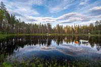 Deze betoverende foto neemt ons mee naar een vredig meertje in Zweden, waar de stilte en de kalmte de hoofdrol spelen. Het meertje ligt als een spiegel, perfect glad en reflecterend.