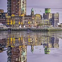 Het fameuze hotel New York, woontoren Montevideo en de graansilo van Katendrecht reflecteren op surrealistische wijze in het digitaal gesimuleerde wateroppervlak van de Nieuwe Maas bij het vallen van de avond.
