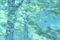Abstract fotowerk van waterspiegelingen van bomen met een blauwe en turquoise achtergrond.